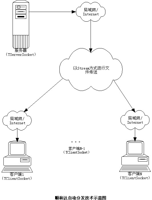 ·自動(dòng)分發(fā):當(dāng)服務(wù)器端版本升級(jí)后,客戶端登陸后自動(dòng)得到服務(wù)器端分發(fā)。讓遠(yuǎn)在全球的客戶端自動(dòng)得到版本升級(jí),使整個(gè)管理系統(tǒng)版本一致。(技術(shù)示意圖